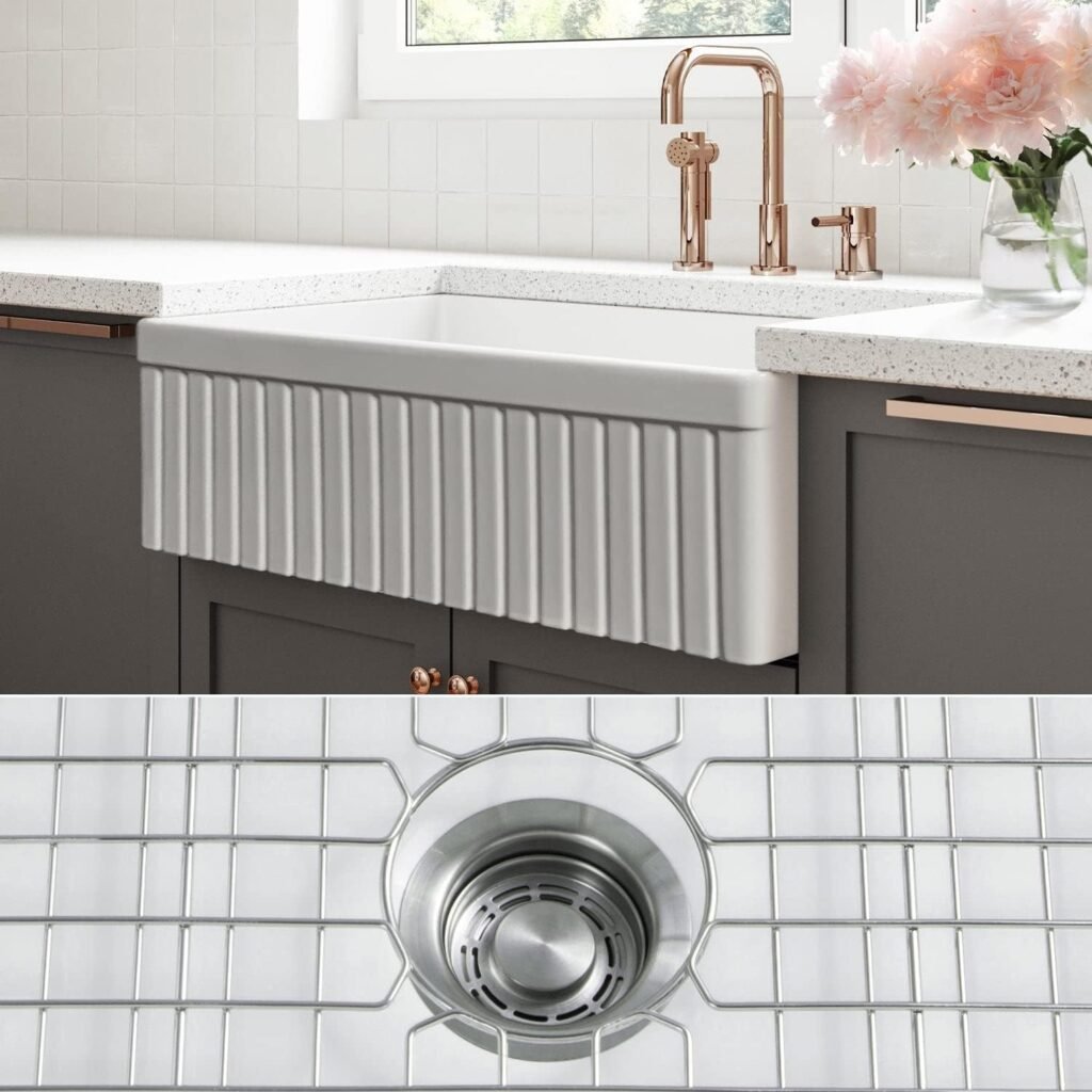 The FSW1007 Luxury Farmhouse Sink is more than just a kitchen fixture—it’s a statement piece. The fluted apron-front design adds a touch of artistry to your kitchen, while the solid fireclay material ensures long-lasting performance. Its generous size and included accessories make it as practical as it is beautiful, catering to both aesthetic and functional needs.