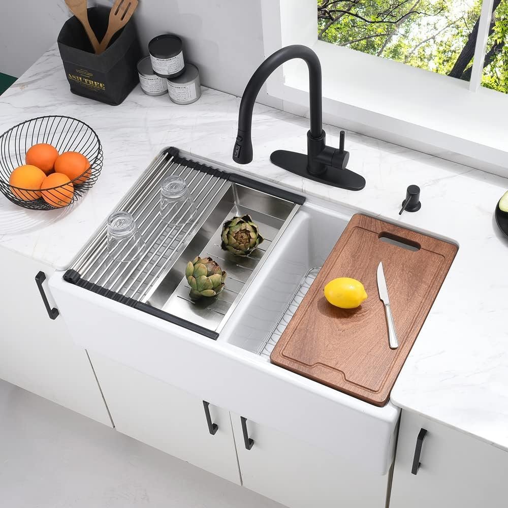 This sink is more than just a washing station; it includes workstation accessories that enhance functionality. Accessories like a drying rack and cutting board fit seamlessly over the sink, allowing you to prep, clean, and organize all in one place, saving counter space and improving workflow.Elegant Apron-Front Design