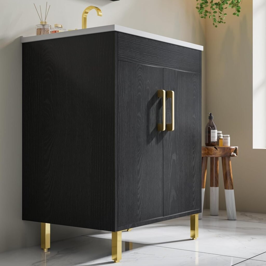 phiestina Fully Pre-Assembled Black 24 Inch Bathroom Vanity with Single Ceramic Countertop Sink Combo, 2 Soft Close Doors Bathroom Cabinet Set, Faucet Not Included,BV01-BLACK-JH
