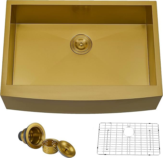 HOTIS Gold Farmhouse Sink, 30 Inch Gold Kitchen Sink, Flat Apron-Front Undermount Drop In Farm Sink, Stainless Steel Single Bowl Handmade Farmhouse Kitchen Sink, Workstation Sink With Accessories