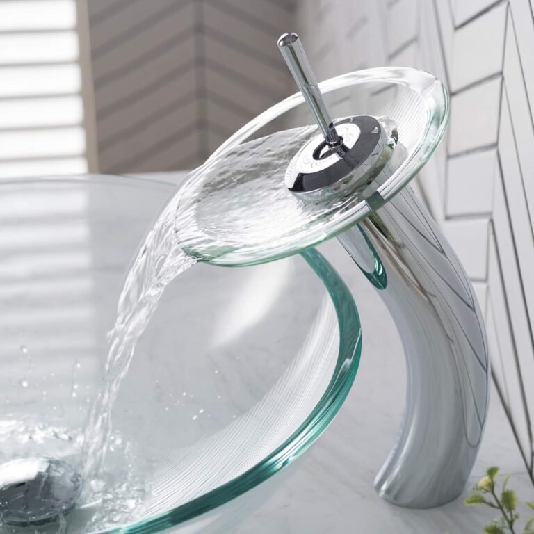 The Kraus Tall Waterfall Bathroom Faucet for Vessel Sink with Clear Glass Disk, Chrome (KGW-1700CH-CL) combines modern aesthetics with functionality, making it the perfect addition to any contemporary bathroom. With its waterfall flow, clear glass disk, and durable brass construction, this faucet offers a luxury experience that’s both visually stunning and practical. Whether you’re outfitting a sleek master bath or updating a guest bathroom, the Kraus Tall Waterfall faucet provides a perfect balance of style, efficiency, and performance. Add a touch of sophistication to your bathroom with this modern fixture that enhances both form and function.