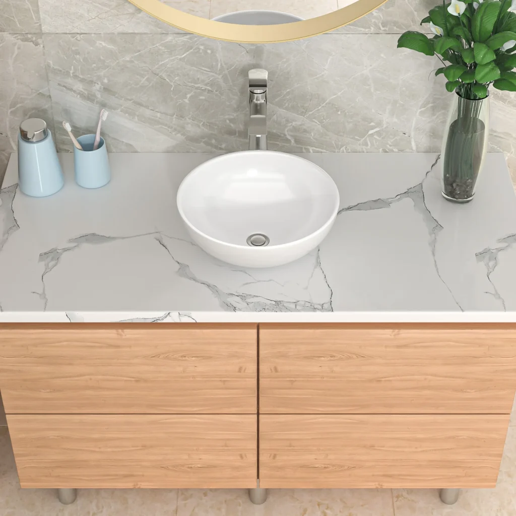 A chic and compact vessel sink that blends durability, style, and affordability, making it a fantastic choice for small-scale bathroom renovations.
